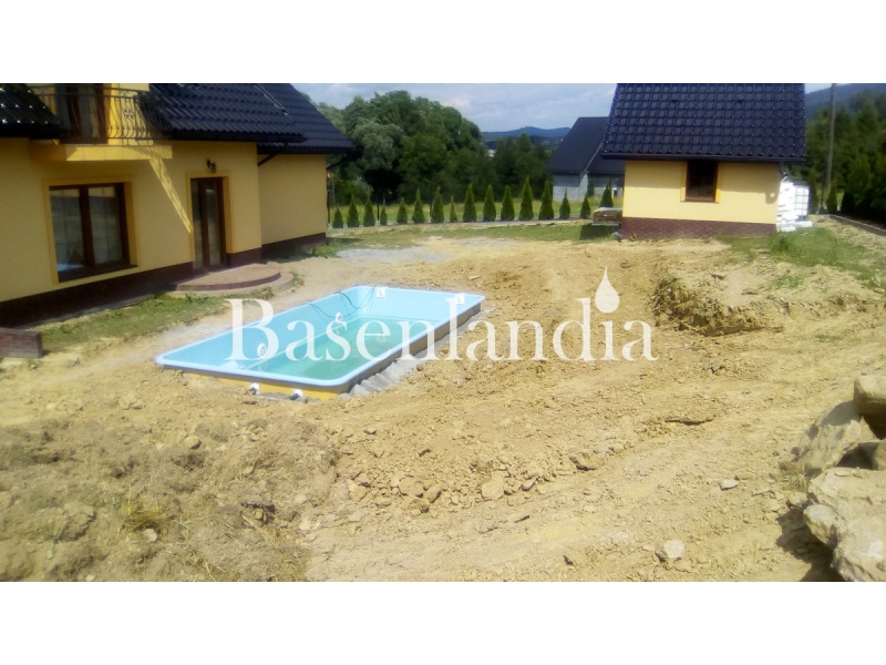 Prezentowana realizacja przedstawia montowany basen w bardzo skalistym gruncie. Utrudnienia okazały się na tyle poważne, że należało skorzystać z pomocy koparki wyposażonej w młot hydrauliczny. Dopiero po pozbyciu się wystających skał, można było przystąpić do wylania płty fundamentowej, wypoziomowania jej i układania warstwy styropianu. Następnie do basenu zostały przymocowane specjalne pasy, które umożliwiły podniesienie go dźwigiem. Basen ustawiono w wykopie i można było przystąpić do napełniania go wodą, obsypywania ziemią i betonem. W międzyczasie należało wymurować studzienkę na filtrację i podłączyć orurowanie do skimmerów i dysz napływowych.
