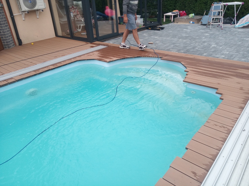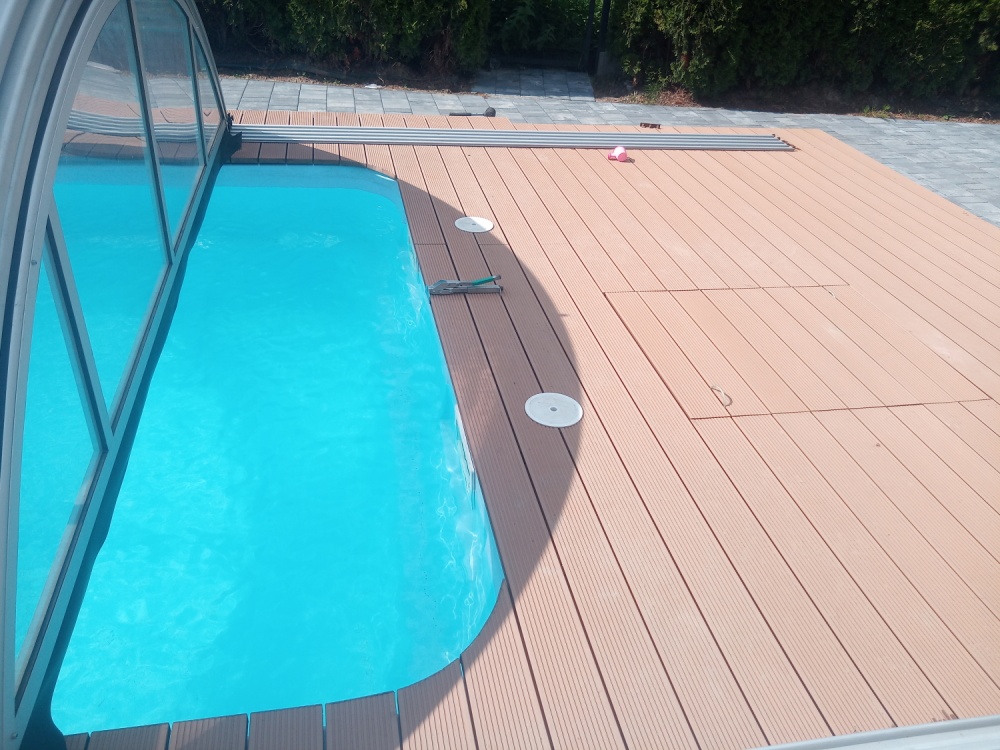 Tarasy przy basenach - Taras przy basenie w Bytomiu z deski kompozytowej Twinson
